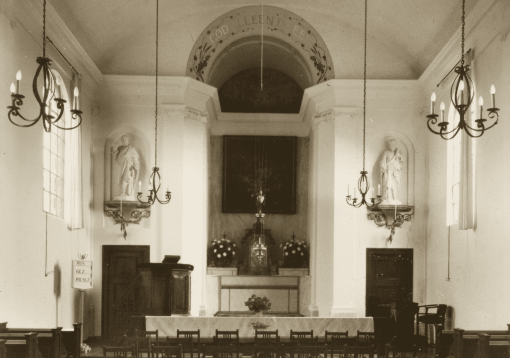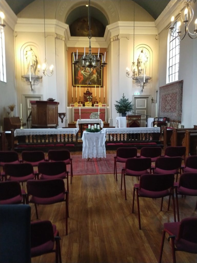 Ook binnen zijn er veranderingen: de piano staat nu links van het altaar en heeft wielen gekregen. Dat was een grote wens van beheerder Roeland Nieuwenhuis, waardoor de piano nu veel gemakkelijker inzetbaar is bij verhuuractiviteiten in de kerk. De preekstoel moest daardoor wat opschuiven, maar daarmee staat deze eigenlijk weer op z’n originele plek in de kerk, zoals te zien op de foto uit 1924 hieronder. Bovendien is de preekstoel nu weer toegankelijk voor de voorganger en met de lezenaar naar de gemeente gericht in plaats naar de muur.