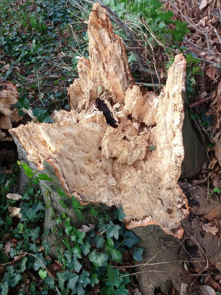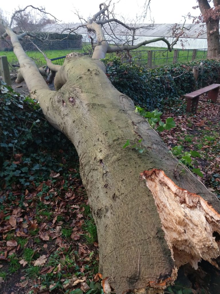 Eind 2025 viel een andere boom om door ouderdom aan het Pastoorslaantje, tussen het park en de Kerkweg. Daarvan zijn de foto’s hieronder.